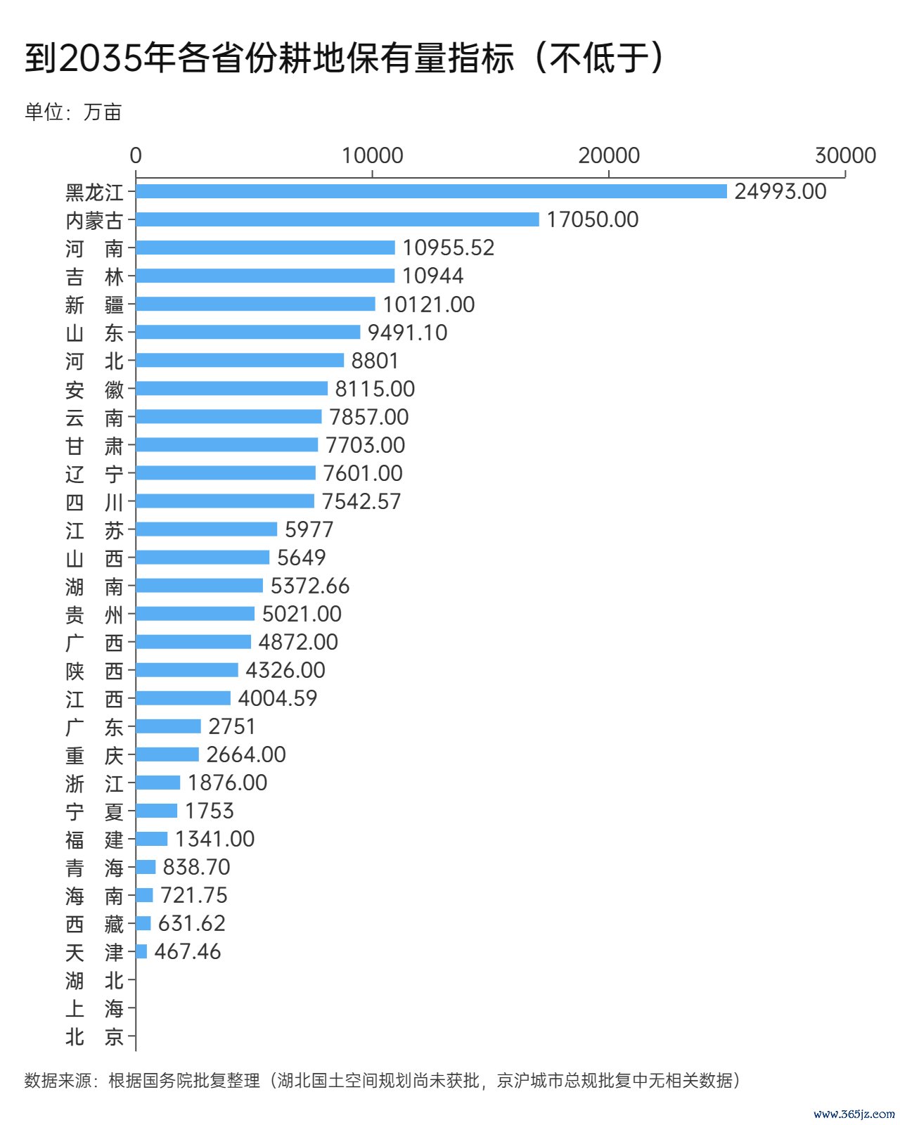 当然,基于不同的自然资源“家底”,各地的任务量有所区别,比如到2035年黑龙江耕地保有量要求不能低于24993.00万亩,内蒙古、河南、吉林、新疆四个省份不能低于10000万亩,青海、海南、西藏、天津则不足1000万亩。